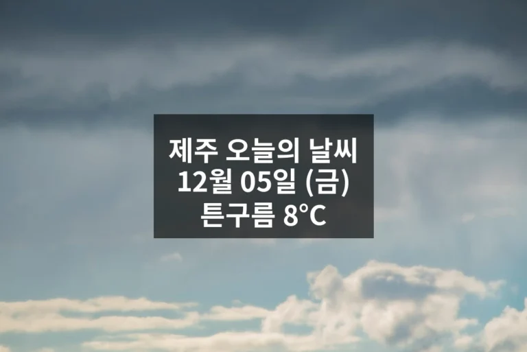 오늘의 날씨 핵심 요약 12월 5일 금요일, 제주는 하루 종일 쌀쌀한 날씨가 예상됩니다. 현재 기온은 8°C지만, 강한 바람 때문에 체감 온도는 5°C까지 떨어져 있어요. 최저 기온과 최고 기온 모두 8°C로 하루 종일 큰 변화 없이 서늘하겠습니다. 하늘은 튼구름이 간간이 보이겠지만,…