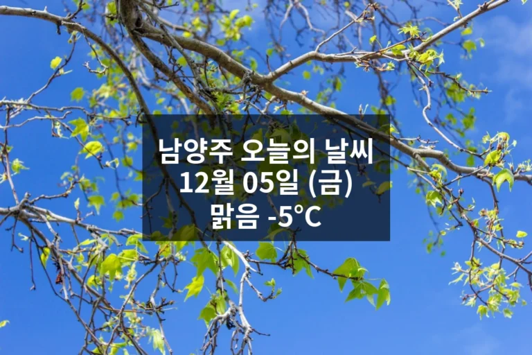 오늘의 날씨 핵심 요약 남양주, 12월 5일 금요일은 매서운 한파가 이어지는 하루가 예상됩니다. 현재 기온과 최저, 최고 기온 모두 영하 5도로 큰 변화 없이 추울 거예요. 특히 체감 온도는 영하 9도까지 내려가 매우 쌀쌀한 편입니다. 하늘은 맑게 개어 있지만, 시원한…