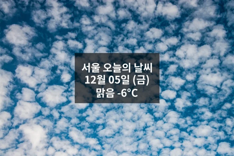 12월 5일 금요일, 서울은 하루 종일 영하권의 매서운 추위가 이어지겠습니다. 현재 기온은 -6°C에 불과하며, 바람이 더해져 체감 온도는 -11°C까지 뚝 떨어졌어요. 낮 최고 기온도 -5°C에 머물러 종일 코끝이 시린 날씨가 예상됩니다. 맑은 하늘이 예상되지만, 강한 추위 속 습도는 63%를 유지하고 있어요....