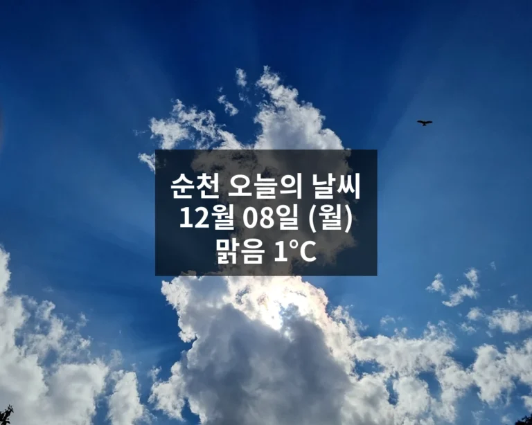 오늘의 날씨 핵심 요약 12월 08일 월요일, 순천은 맑은 하늘 아래 하루를 시작합니다. 현재 기온은 1°C로, 겨울의 문턱에 들어섰음을 실감하게 해요. 체감 온도는 -1°C로 실제 기온보다 더욱 쌀쌀한 편입니다. 오늘 최저 기온과 최고 기온 모두 1°C에 머물러 하루 종일 큰…